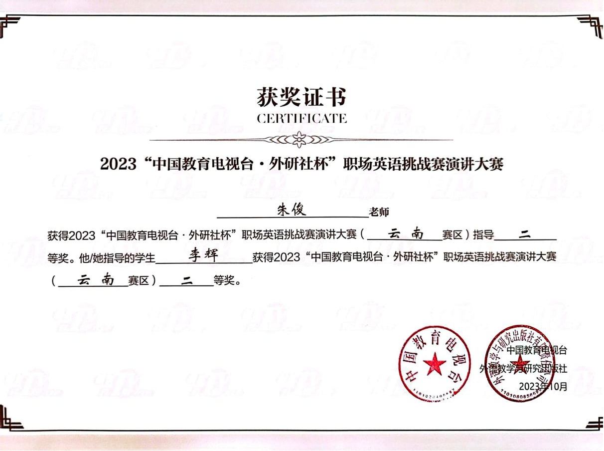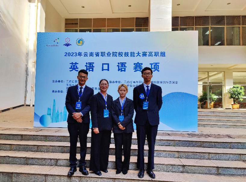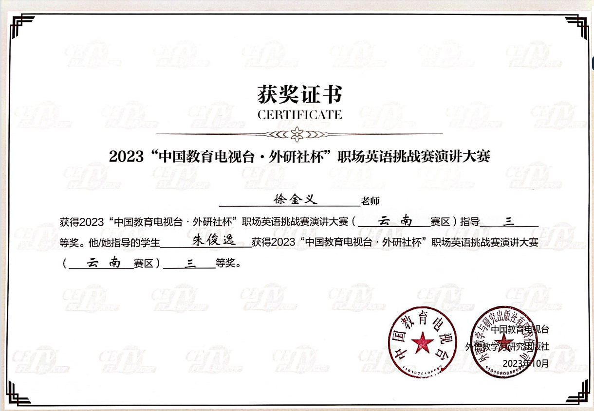 外国语学院2023“中国教育电视台•外研社杯职场英语挑战赛演讲大赛暨2023年云南省职业院校技能大赛高职组英语口语赛项中荣获佳绩:英语专业组师生同赛-朱俊老师  李辉,获云南赛区二等奖;大学英语组师生同赛-徐金义老师 朱俊逸,获云南赛区三等奖。