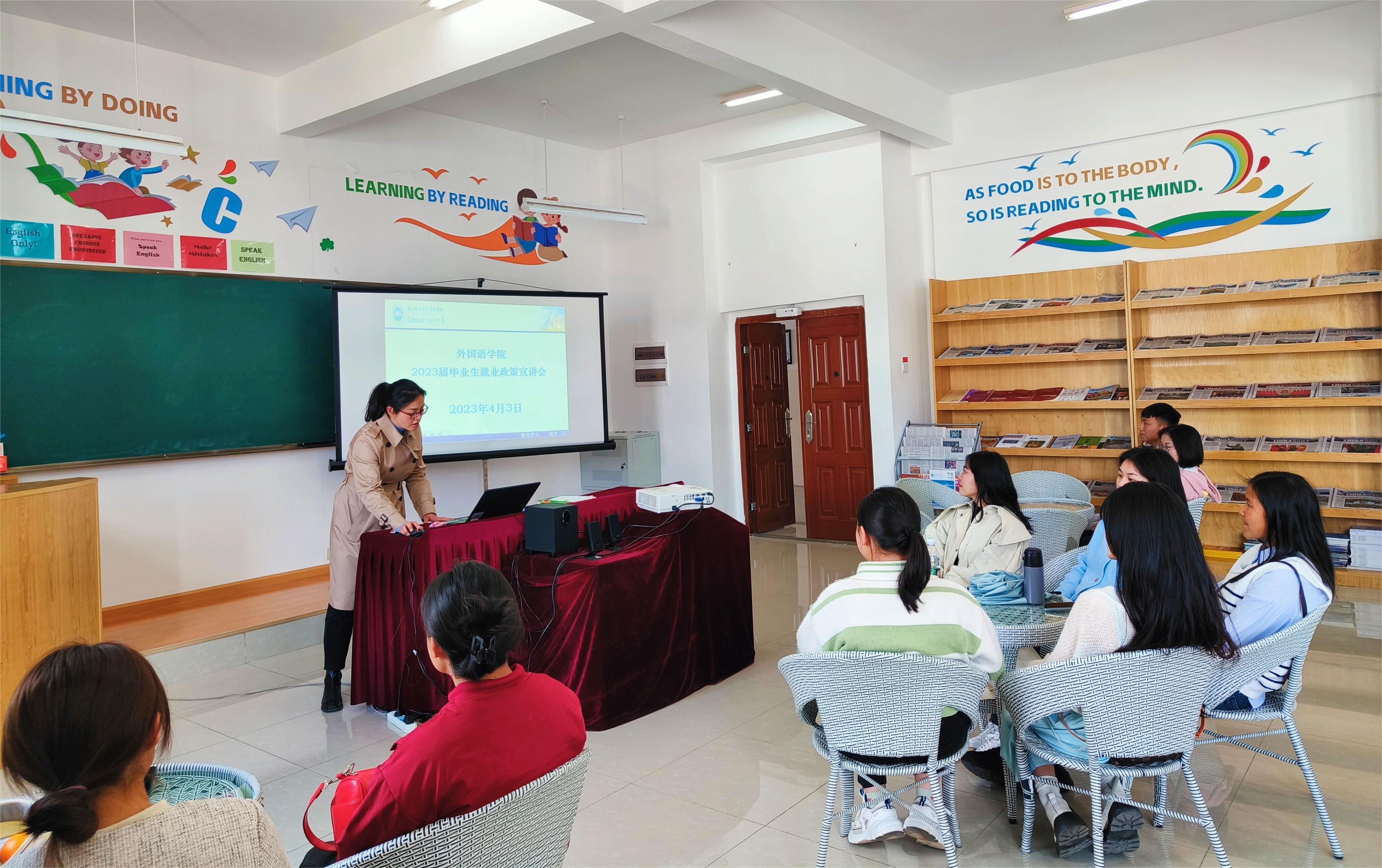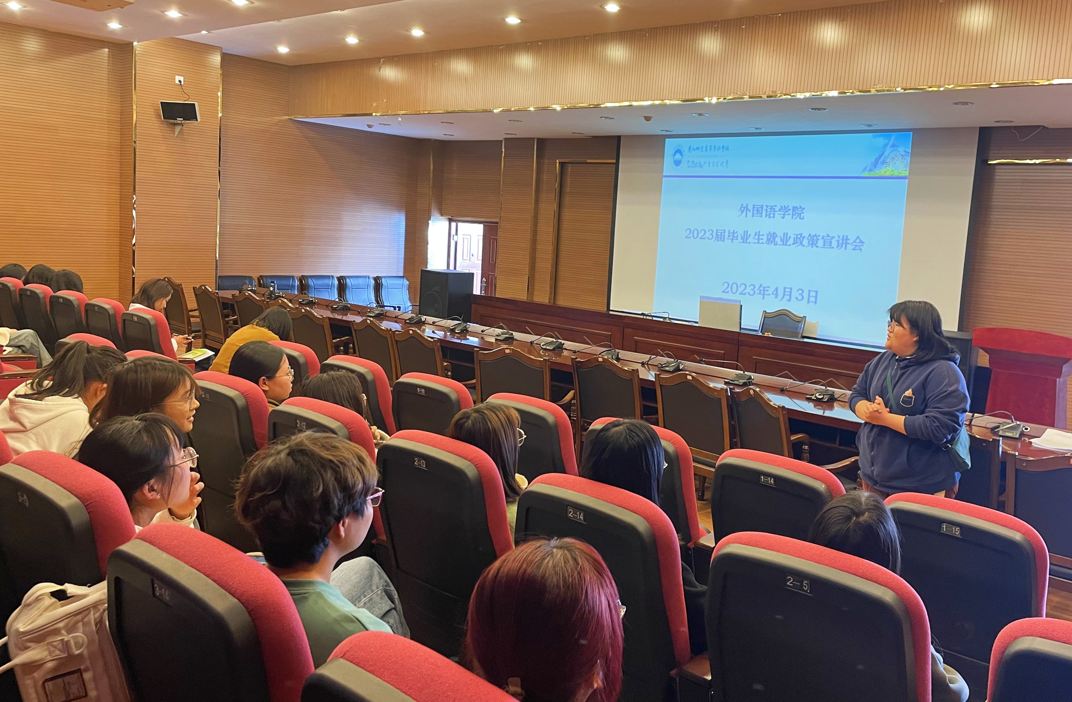2023年4月3日至4日,外国语学院在求是楼举办2023届毕业生就业政策宣讲会。本次宣讲会共两场,分别面向英语教育专业学生和应用英语、旅游英语专业学生。学校就业服务中心、学院相关领导出席本次活动,宣讲会由学院2023届辅导员和婷主持。