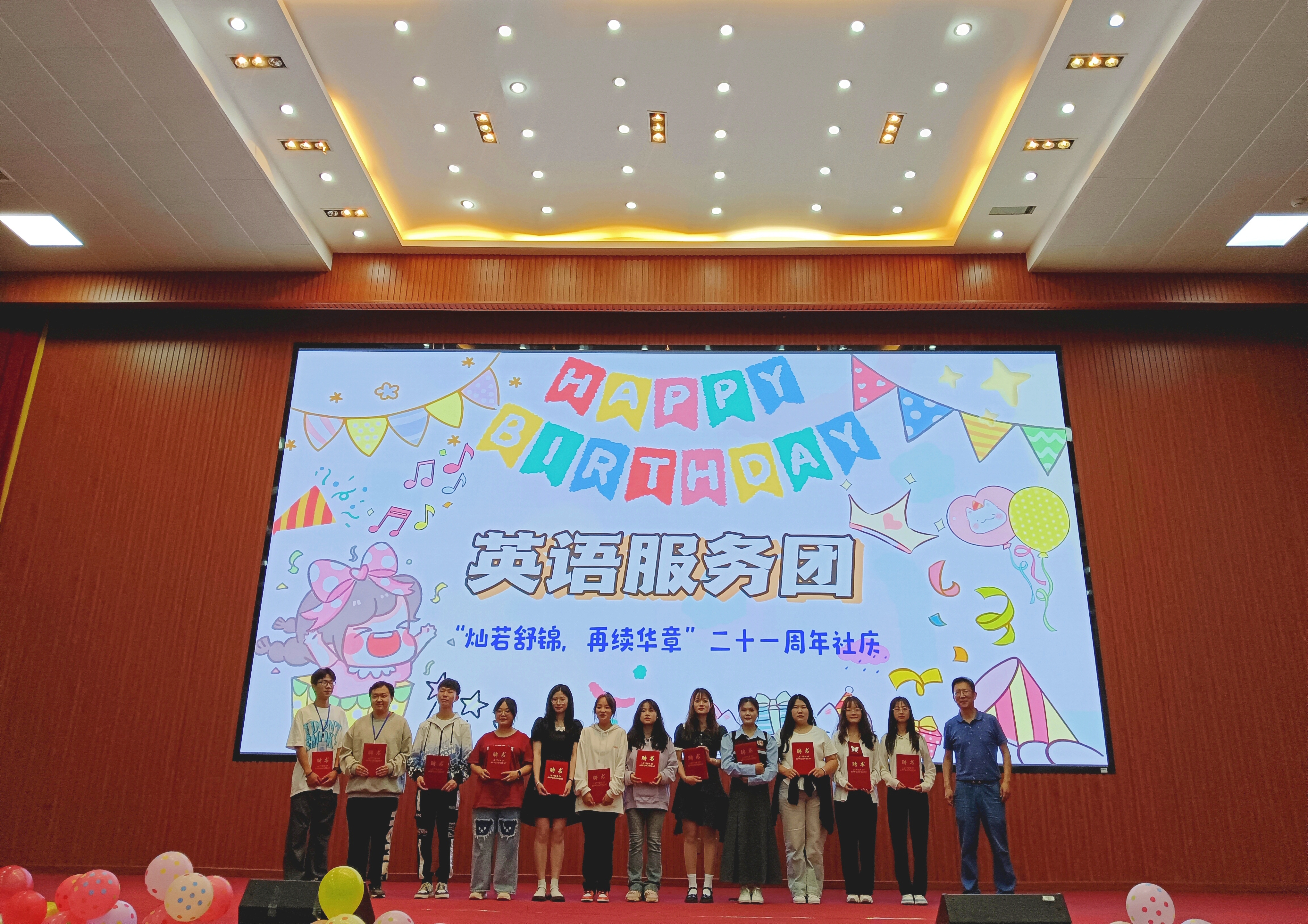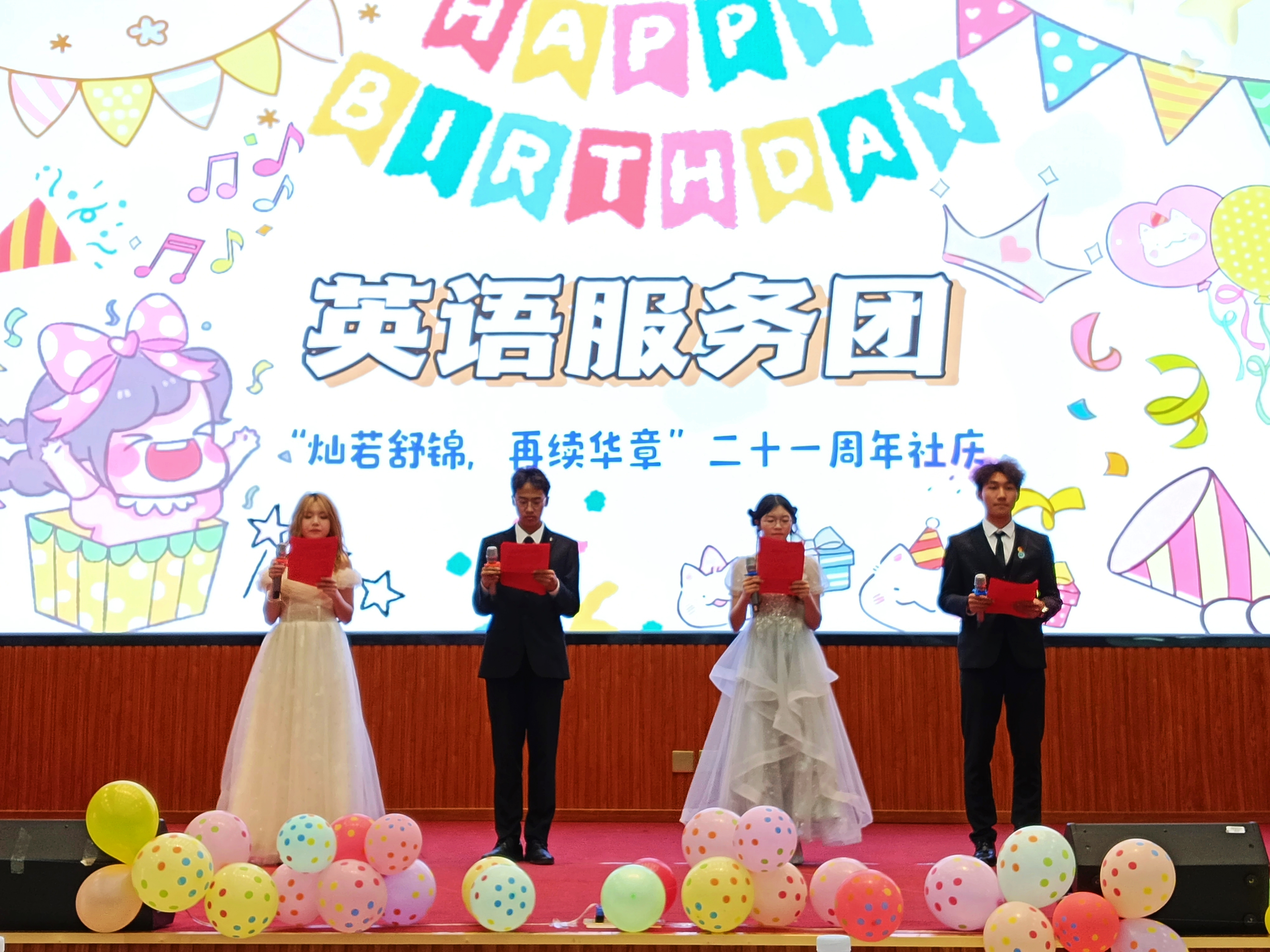2024年6月1日,外国语学院英语服务团在图书馆报告厅举行了盛大的21周年社庆活动。本次活动由外国语学院英语服务团主办,学院团总支协办。活动主题为“灿若舒锦,再续华章”,寓意英语服务团如锦绣般灿烂,团队成员们的努力和付出如同阳光照耀下的锦绣河山。